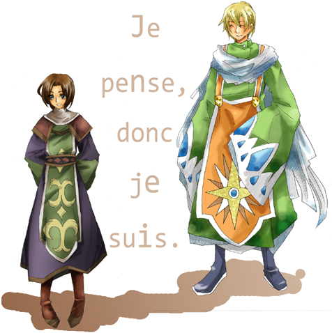 C O M M E N T 10周年記念集合絵に応募させていただいた子弟二人をあわせてみました。 Je pense,donc je suis.は仏語、我思う、ゆえに我あり(デカルト)です。 ちなみに仏語はさっぱりわからないのでコピp(ry この言葉を引用した理由は術師と哲学者は割と近いところにいるイメージだから、というだけです。適当。 PICTに戻る